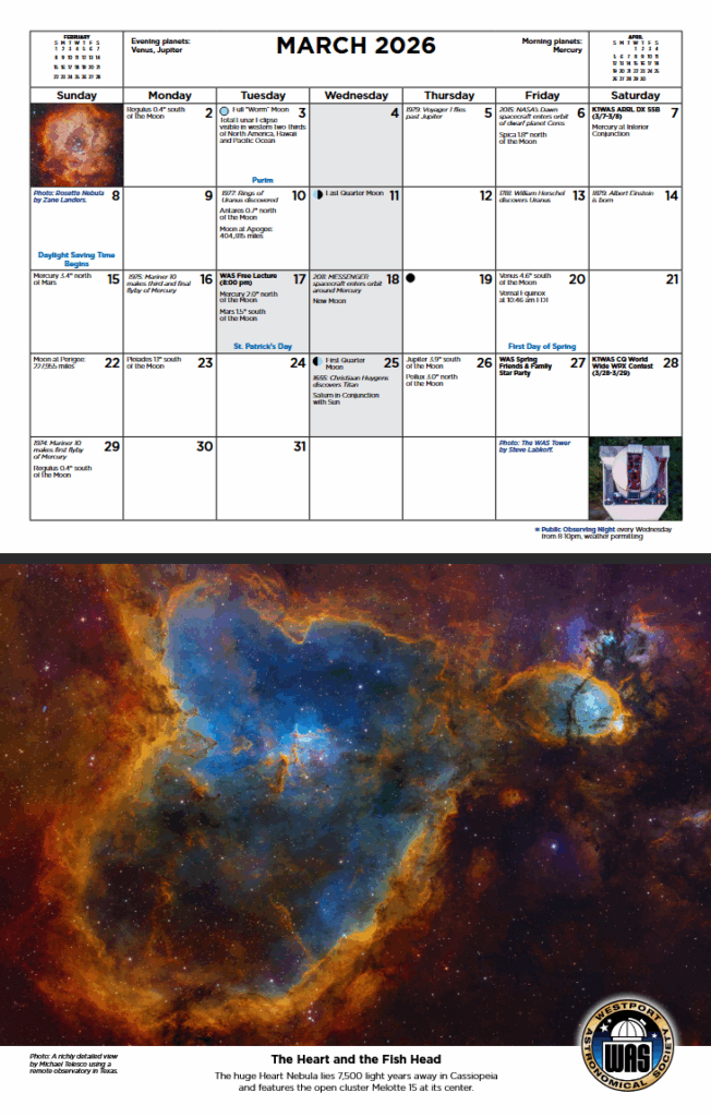 The Westport Astronomical Society’s talented astrophotographers have captured the universe once again! Featuring breathtaking images from WAS members Michael Southam, Franco Fellah, Stuart Stakoff, Kurt Zeppetello, Zane Landers, Dana Weisbrot, Michael Telesco, Carl Lancaster, Phil Harrington, Louis Tancredi, Dr. Steven Labkoff, and Shannon Calvert — the 2026 WAS 13-Month Calendar is here!