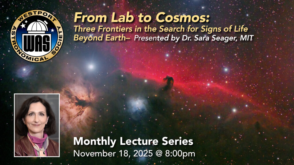 Join us LIVE in the classroom and online for this lecture. Professor Seager will join us online. This event will be live-streamed on YouTube and as a webinar on Zoom, but we’d love to see you in person in the classroom at the Westport Observatory. As always, the talk will be posted to the Westport Astronomical Society’s YouTube channel afterwards.